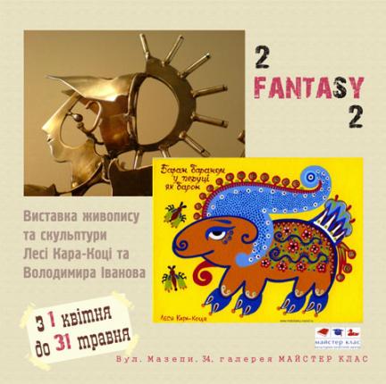 В галерее "Мастер Класс", Киев ул. Ивана Мазепы, 34 пройдет совместная выставка Леси Кара-Коци и Владимира Иванова "Фентези в квадрате". Мир фантазий и игр определяет личность. Казалось бы — что общего между милым, домашним "украинским народным фентези" Леси Кара-Коци и рафинированным "техно-эллинизмом" стальных коней и воинов Владимира Иванова? Если у Леси Кара-Коци игра в куклы, то у Владимира Иванова — игра в солдатики. Стремительные лошади, легендарные герои, роковые стрелы ... Если инструментом Леси является Цвет, то ажурная металлическая каллиграфия Владимира Иванова работает со Светом. Эти два художника удивительным образом оттеняют друг друга. Перед вами два мира. Два фентези. Точнее — "Фентези в квадрате".