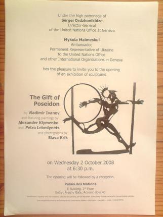 Сегодня ВИ получил на утверждение эскиз приглашения на вернисаж выставки "Дар Посейдона". Вернисаж состоится 2-го октября, в 18:30 во Дворце Наций ООН в Женеве. Комитет по культуре ООН (Женева) разошлет приглашения 1500 адресатам из других международных организаций, дипкорпуса, администрации Женевы и одноименного кантона, швейцарской общественности и масс-медиа.