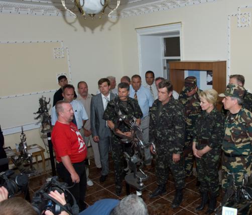 Подплыть впритык к причалу нельзя, он выше корабля на два метра. От причала к мостику ведет тонкая круглая труба длиной два метра. Скульптуры, стоимость которых от 5 тысяч евро, переносят по ней вручную. Президент с почетом прилетает тремя вертолетами с армейского полигона на Одесчине. Все в камуфляже, Богатырева еще и в ботинках на высоких каблуках и с портупеей, чтобы подчеркнуть талию.